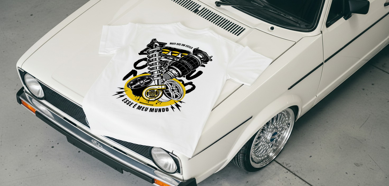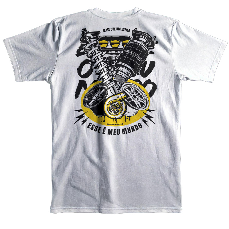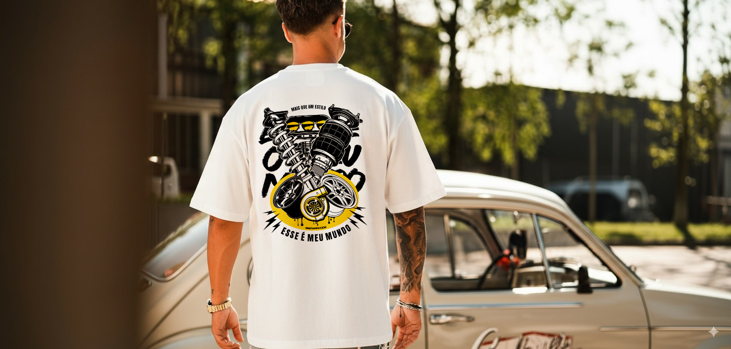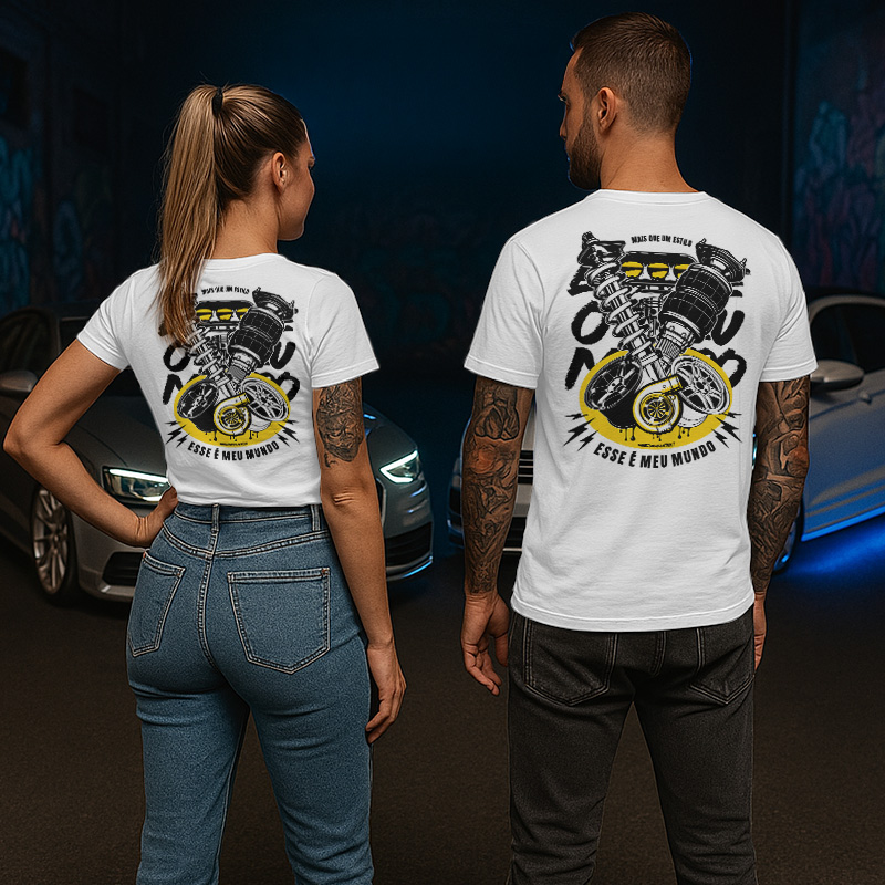A camiseta “Esse é Meu Mundo” é mais que uma peça de roupa: é um manifesto de quem vive intensamente a cultura dos carros rebaixados, turbos, suspensão a ar e toda a essência da cena automotiva.