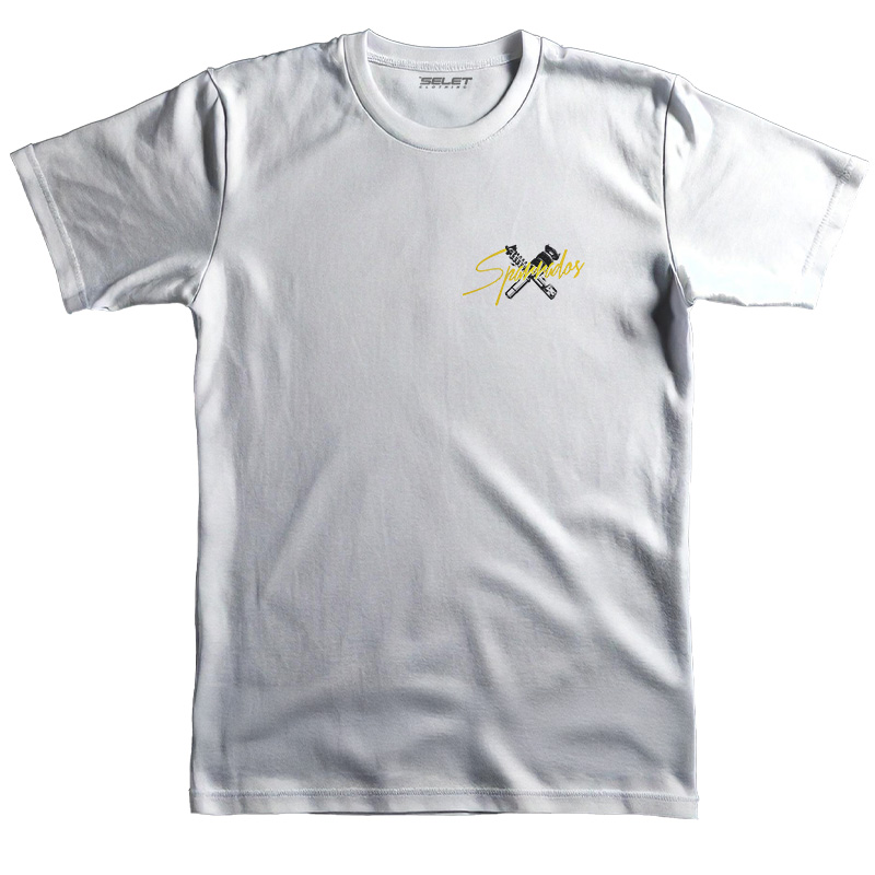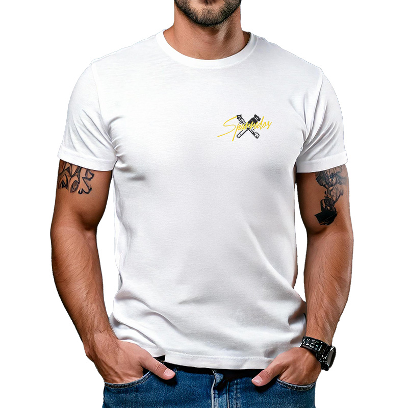 Na parte de trás, a estampa exclusiva Sparrados traz um Supercharger Blower em destaque, acompanhado de roda esportiva, turbina, amortecedor e bolsa de ar – todos os elementos que representam o verdadeiro DNA da personalização automotiva. O fundo amarelo vibrante contrasta com o preto da ilustração, criando um visual impactante e cheio de atitude.