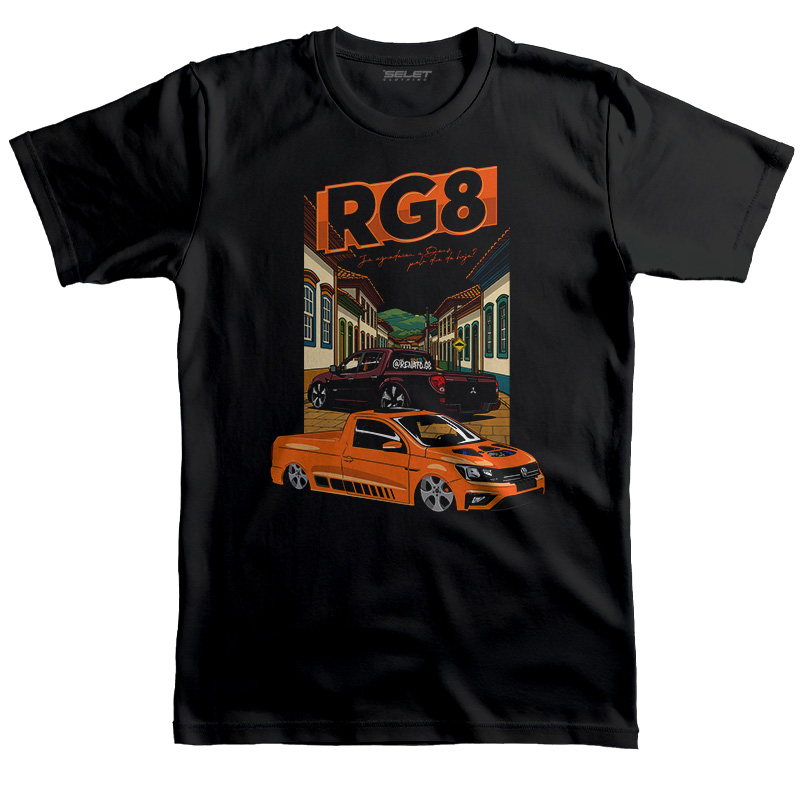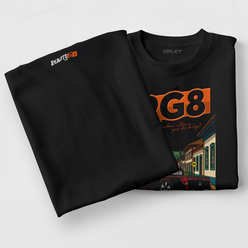 A estampa desta camiseta traz um encontro marcante direto das ruas de Minas: a lendária Saveiro laranja do Renato da G8 e a imponente Mitsubishi L200, estacionadas em um cenário clássico de cidade histórica mineira, com casarios coloniais e calçamento de pedra.