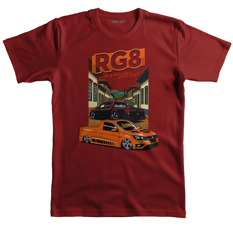 A estampa desta camiseta traz um encontro marcante direto das ruas de Minas: a lendária Saveiro laranja do Renato da G8 e a imponente Mitsubishi L200, estacionadas em um cenário clássico de cidade histórica mineira, com casarios coloniais e calçamento de pedra.